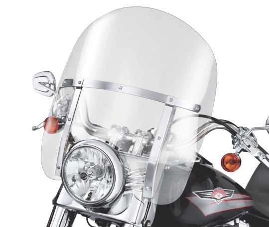 Diese Windschutzscheibe im kräftigen Look des FL Softail Frontscheinwerfers kann ohne Werkzeuge im Handumdrehen an- oder abgebaut werden.