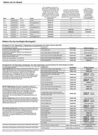 Passend für Harley-Davidson Softail FXST, FXSTB, FXSTS, FXSB, FXSBSE, FXSTSSE/2/3,FLSTFSE2, FLSTSE/2/3, FLST, FLSTF, FLSTFB, FLSTN,FLSTNSE, FLSTSB, FLSTSC Modelle ab ’00 mit oder ohne Satteltaschen (außer Heritage Satteltaschen P/N 90876-05). Erfordert das Montagekit und ggf. eine Blinkerverlegung. Siehe Übersicht für das jeweilige Modell.