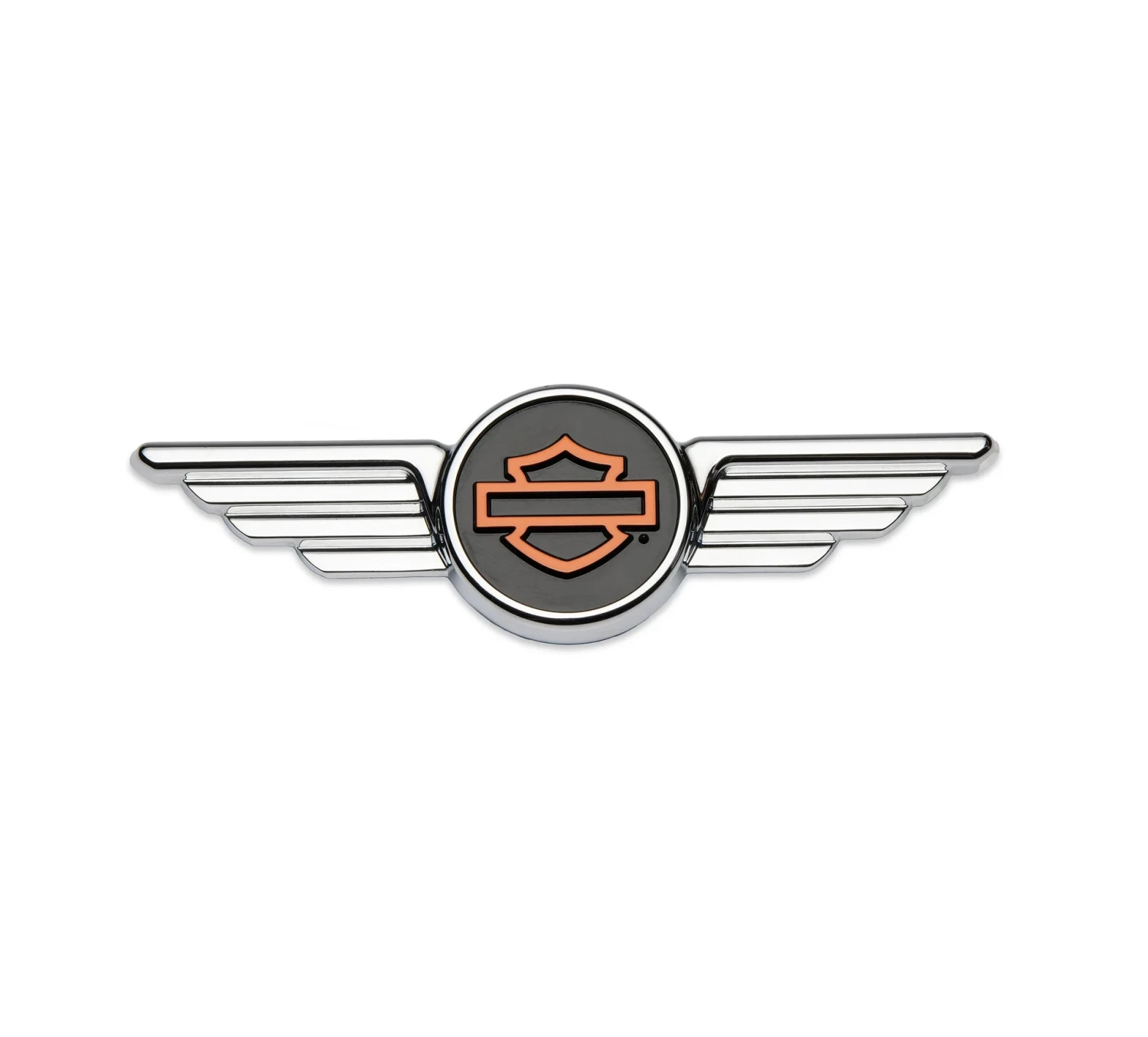 - Glänzende Chromflügel flankieren ein zentriertes schwarzes und oranges Bar & Shield-Logo