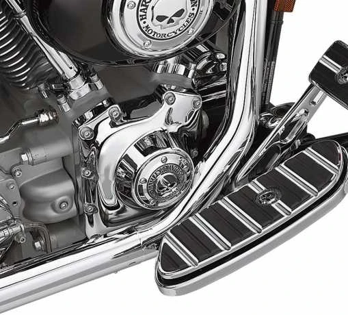 - Der verchromte vordere Auspuff-Hitzeschild ersetzt den vorderen Original-Hitzeschild und deckt das freiliegende Auspuffrohr neben dem Fahrertrittbrett ab