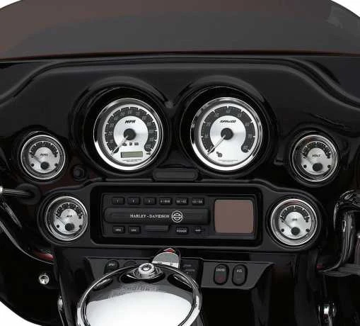 Diese erstmals bei den Screamin‘ Eagle Deuce und Electra Glide Modellen ’04 angebotenen Instrumente mit Aluminiumguss-Zifferblatt stellen einen deutlichen Kontrast zu einer Chromkonsole oder einer schwarzen Innenverkleidung dar.