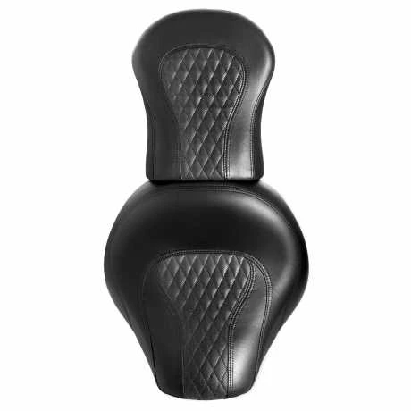 Bleiben Sie den ganzen Tag im Sattel. Diese Harley Hammock Sitze haben breite Sitzflächen und eine flache Schalenform, um das Gewicht gleichmäßig zu verteilen und Druckstellen zu verringern. Das Körpergewicht des Fahrers wird unter dem zwei Zoll dicken herkömmlichen Schaum aus zwei unterschiedlichen Dichten durch ein revolutionäres Textilfederungssystem unterstützt. Das schlingenähnliche Federungssystem ist in den Sitz integriert und die zwei Zoll Federung wirkt über der Sitzwanne wie eine Hängematte. Dieses innere System verhindert ein Durchsacken und erhöht Komfort und Ausdauer auf langen Strecken um 30 %, indem es den Fahrer vor Stößen durch Schlaglöcher und Dehnungsfugen an Autobahnen schützt. Die mit rautenförmigen Nähten versehene Vinyloberfläche des Sitzes lässt sich leicht reinigen und pflegen und kann mit einer optionalen Fahrerrückenlehne als Rückenstütze ausgerüstet werden.
