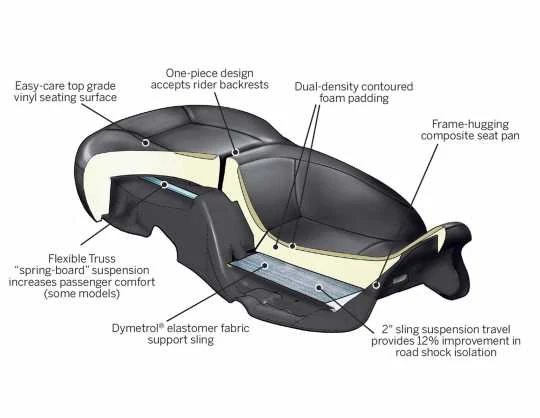 - Für den Fahrer wirkt das schlingenähnliche Textilfederungssystem wie eine Hängematte, indem Stöße reduziert werden, und die zwei Zoll dicke, traditionelle Schaumstoffauflage bietet eine zusätzliche Stütze