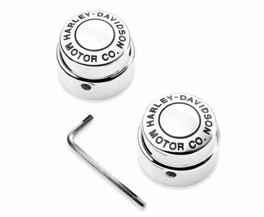 Gegossene und verchromte Kappen mit schwarzem „Harley-Davidson Motor Co.“ Logo.