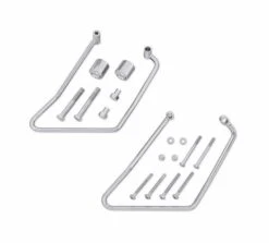 - Der elegant verchromte Rahmen wird am oberen Stoßdämpferlager und der Fenderstrebe befestigt und kann an Modellen mit fest montierten Sissy Bar Seitenplatten und Bügeln angebracht werden
