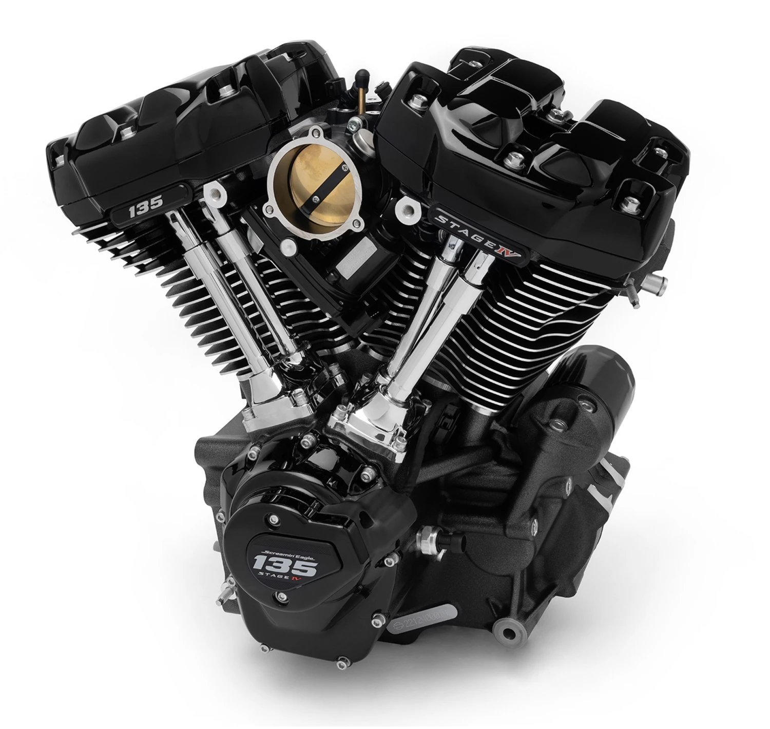 Der Screamin Eagle Crate Motor 135CI Stage IV Performance ist für Fahrer, die kompromisslose Leistung auf der Rennstrecke verlangen. Dies ist der größte Hubraum und die größte Leistung, die Harley-Davidson jemals für einen US-straßentauglichen Motor entwickelt hat. Dieser von den Harley-Davidson-Profis entwickelte und in Milwaukee von Grund auf neu entwickelte 135-cubic-inch Screamin‘ Eagle® Crate-Motor ist so konzipiert, dass er bei hohen Drehzahlen mit weit geöffneter Drosselklappe läuft und aus dem Stand sofortige Überholleistung bietet. Er wurde für Fahrer entwickelt, die ein Maximum an Hubraum, Verdichtung und Durchfluss suchen und liefert 144 PS und 149 ft-lb Drehmoment an das Hinterrad! Das Verdichtungsverhältnis des 135-cm³-Motors beträgt 11,6:1. Exklusive 135er- und Stage IV-Schriftzüge auf den Zylinderköpfen und der Steuergeräteabdeckung heben das Triebwerk hervor. Dieser straßentaugliche Hochleistungsmotor ist mit den besten Screamin‘ Eagle® Komponenten ausgestattet. Viele dieser neuen Komponenten wurden durch umfangreiche Tests des Harley-Davidson Factory Racing Teams für die King of the Baggers Rennserie entwickelt. Der 135ci Crate-Motor besteht aus: Völlig neue Screamin‘ Eagle® Extreme CNC-gefertigte Zylinderköpfe, neue SE8-550 High-Lift-Nockenwelle, neue hochverdichtete Schmiedekolben, 68-mm-Drosselklappe und neuer CNC-gefertigter 68-mm-Extreme-Flow-Ansaugkrümmer, Hochleistungsnockenwellenlager, Hochleistungsstößel, neue patentgeschützte 4,31-Zoll-Stahlhülsenzylinder, 4 5/8-Zoll-Schwungrad, 6,8 g/s-Einspritzdüsen und Screamin‘ Eagle® Pro Billet Nockenplatte und Ölpumpe.