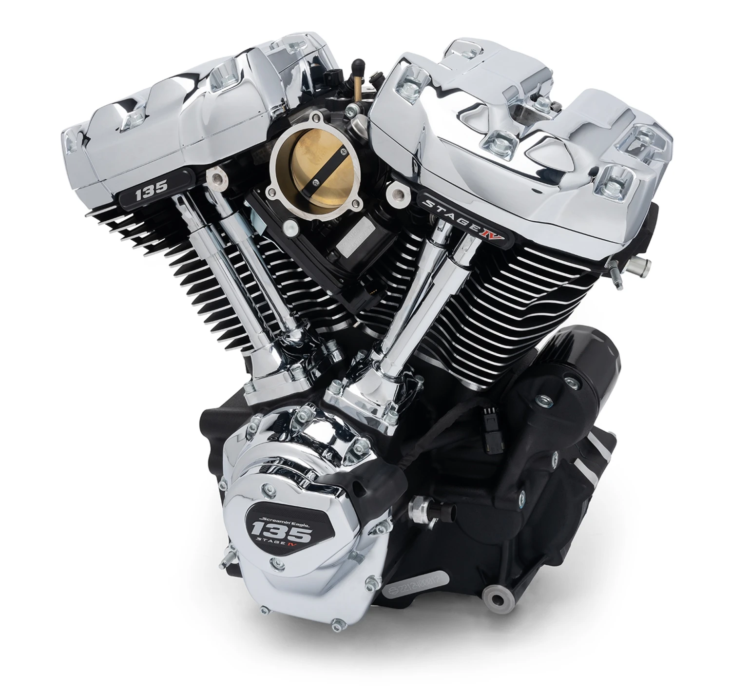 Der Screamin Eagle Crate Motor 135CI Stage IV Performance ist für Fahrer, die kompromisslose Leistung auf der Rennstrecke verlangen. Dies ist der größte Hubraum und die größte Leistung, die Harley-Davidson jemals für einen US-straßentauglichen Motor entwickelt hat. Dieser von den Harley-Davidson-Profis entwickelte und in Milwaukee von Grund auf neu entwickelte 135-cubic-inch Screamin‘ Eagle® Crate-Motor ist so konzipiert, dass er bei hohen Drehzahlen mit weit geöffneter Drosselklappe läuft und aus dem Stand sofortige Überholleistung bietet. Er wurde für Fahrer entwickelt, die ein Maximum an Hubraum, Verdichtung und Durchfluss suchen und liefert 144 PS und 149 ft-lb Drehmoment an das Hinterrad! Das Verdichtungsverhältnis des 135-cm³-Motors beträgt 11,6:1. Exklusive 135er- und Stage IV-Schriftzüge auf den Zylinderköpfen und der Steuergeräteabdeckung heben das Triebwerk hervor. Dieser straßentaugliche Hochleistungsmotor ist mit den besten Screamin‘ Eagle® Komponenten ausgestattet. Viele dieser neuen Komponenten wurden durch umfangreiche Tests des Harley-Davidson Factory Racing Teams für die King of the Baggers Rennserie entwickelt. Der 135ci Crate-Motor besteht aus: Völlig neue Screamin‘ Eagle® Extreme CNC-gefertigte Zylinderköpfe, neue SE8-550 High-Lift-Nockenwelle, neue hochverdichtete Schmiedekolben, 68-mm-Drosselklappe und neuer CNC-gefertigter 68-mm-Extreme-Flow-Ansaugkrümmer, Hochleistungsnockenwellenlager, Hochleistungsstößel, neue patentgeschützte 4,31-Zoll-Stahlhülsenzylinder, 4 5/8-Zoll-Schwungrad, 6,8 g/s-Einspritzdüsen und Screamin‘ Eagle® Pro Billet Nockenplatte und Ölpumpe.