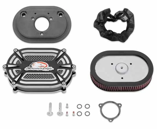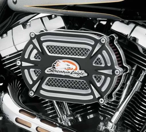 - Die zweiteilige Billet Abdeckung rahmt den Filter ein und ist mit einem farbigen Screamin Eagle Medaillon versehen
