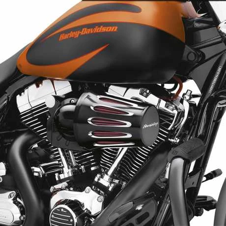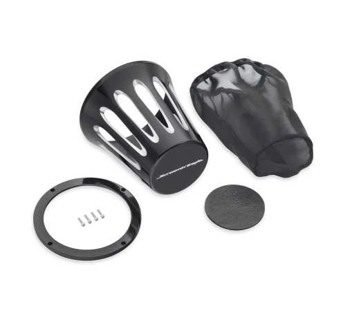 Fits Harley-Davidson Twin Cam & Sportster XL mit Heavy Breather Luftfilterelemente (außer Kompaktausführung P/N 28716-10). Nicht in Verbindung mit dekorativen Filterendkappen. Cut Back schwarz – End-Logo.
