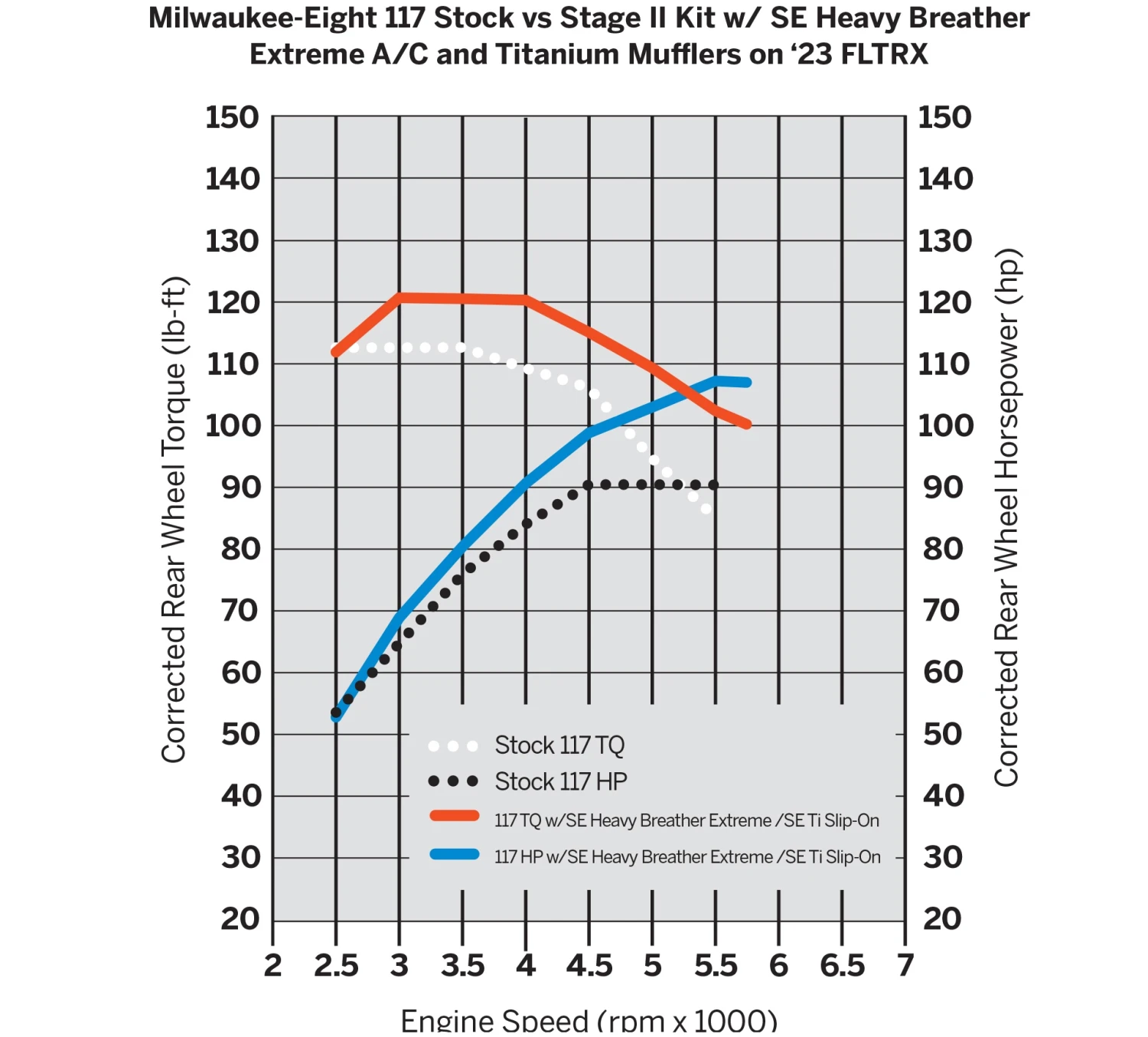 Das Hochleistungs-Nockenwellenprofil SE8-511, das ursprünglich für den Milwaukee-Eight 121 High Output Motor entwickelt wurde, liefert höchste Leistungssteigerung für 117 CI Modelle. Dieses für echte PS-Junkies entwickelte Nockenwellen-Kit liefert bei 4.000 U/min zusätzliche PS und bis zum roten Bereich eine Steigerung um bis zu 21 %.