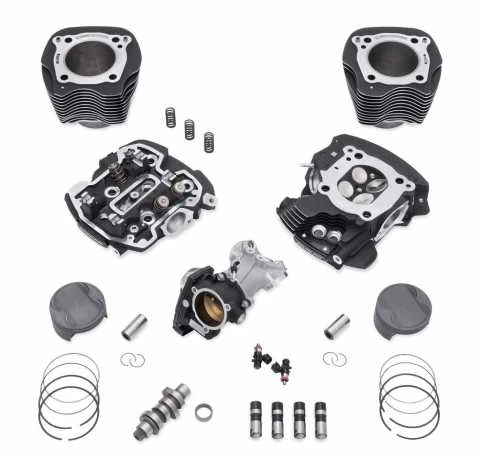 - Screamin‘ Eagle® Zylinderköpfe mit leistungsstarken Ventilfedern, Drosselklappengehäuse, Hochleistungsinjektoren, Anschraubzylinder, Kolben, Kolbenringe, Nocken, Nockenlager, Stößel, Zylinderkopfdichtungen, Kopfende, Zylinderboden- und Nockenabdeckungen sowie Kupplungsfedern.