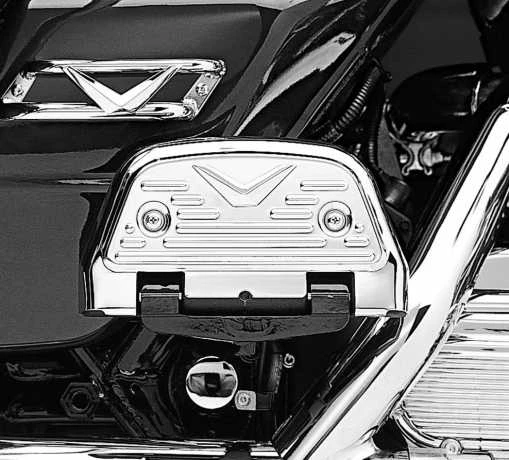 Verchromte Trittbrettabdeckungen aus Aluminiumguss mit V-Logo.