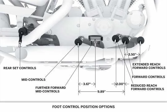- Mit diesem Kit rücken die Fußrasten 3″ vor die serienmäßige Position und verhindern eine Fahrposition mit den „Knien in der Höhe“, während die sportliche, aufrechte Fahrhaltung beibehalten wird