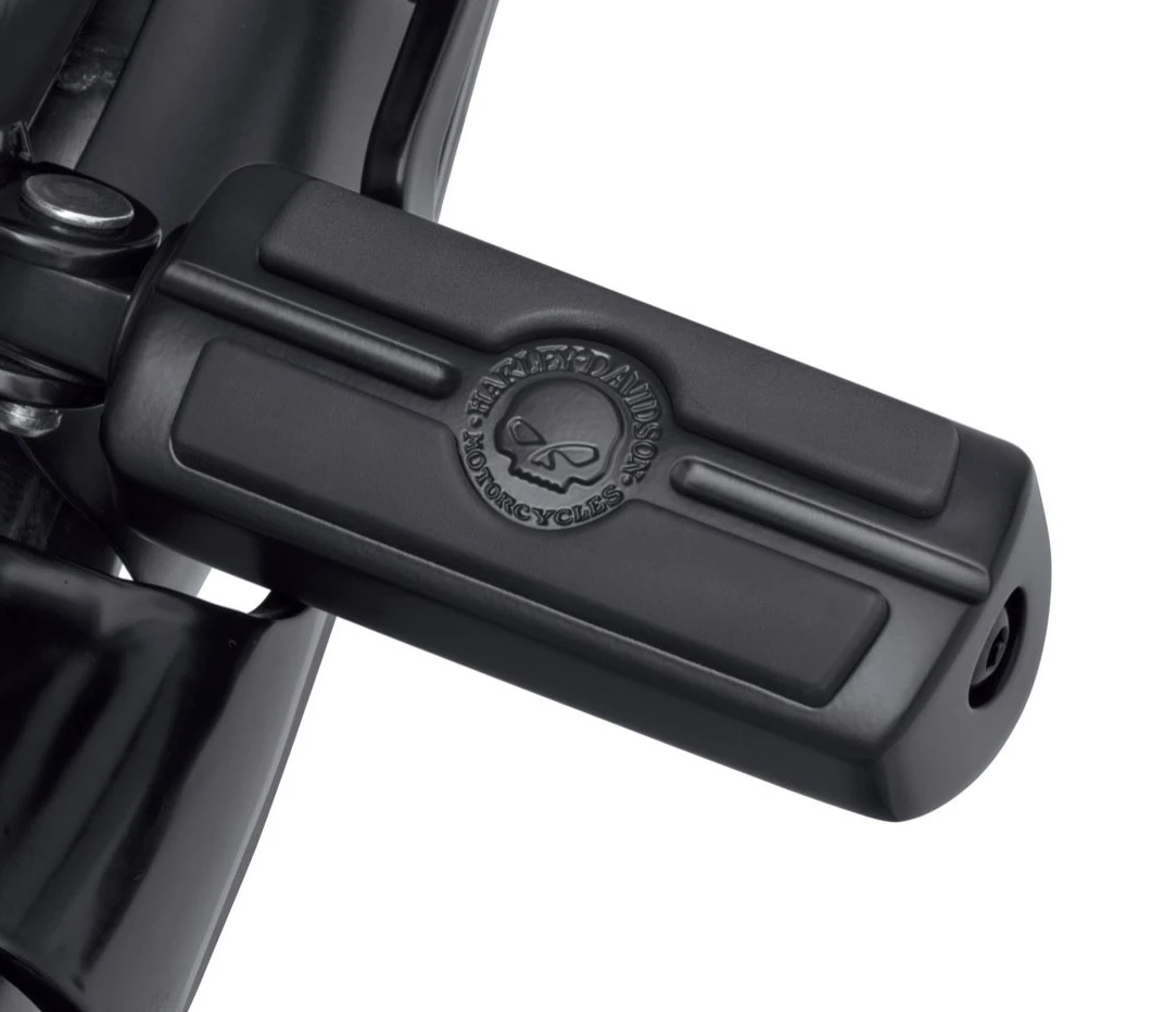 Diese obsidianschwarzen Fußrasten sind auf die anderen Artikel aus der Kollektion Willie G Skull abgestimmt und zeigen einen erhabenen Willie G Skull und den Schriftzug „Harley-Davidson® Motorcycles“ umgeben von tiefschwarzem Gummi für Grip und Traktion.