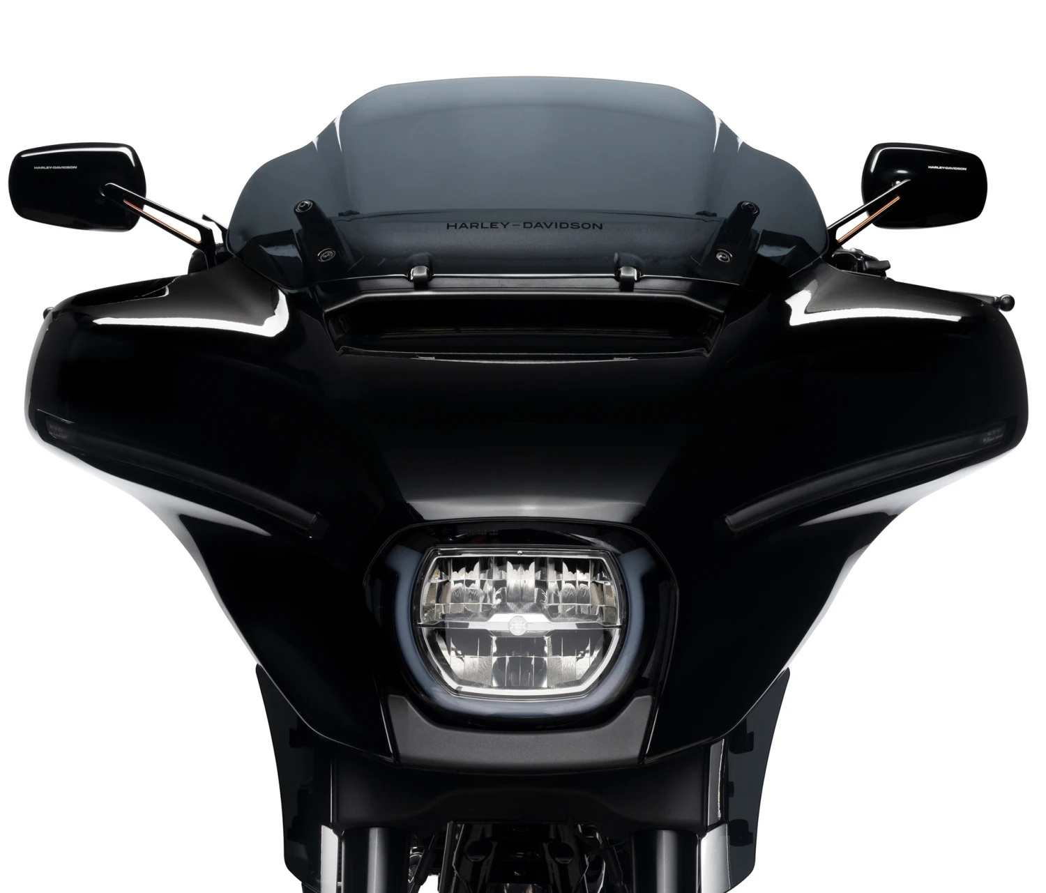 - Dunkel getöntes 20,3 cm hohes Windschild, speziell für Fahrer mit einer Körpergröße zwischen 162 und 175 cm entwickelt. Ein Fahrer mit dieser Körpergröße wird bis zu 50 % weniger Druck auf den Helm als hinter dem serienmäßigen Windschild erfahren